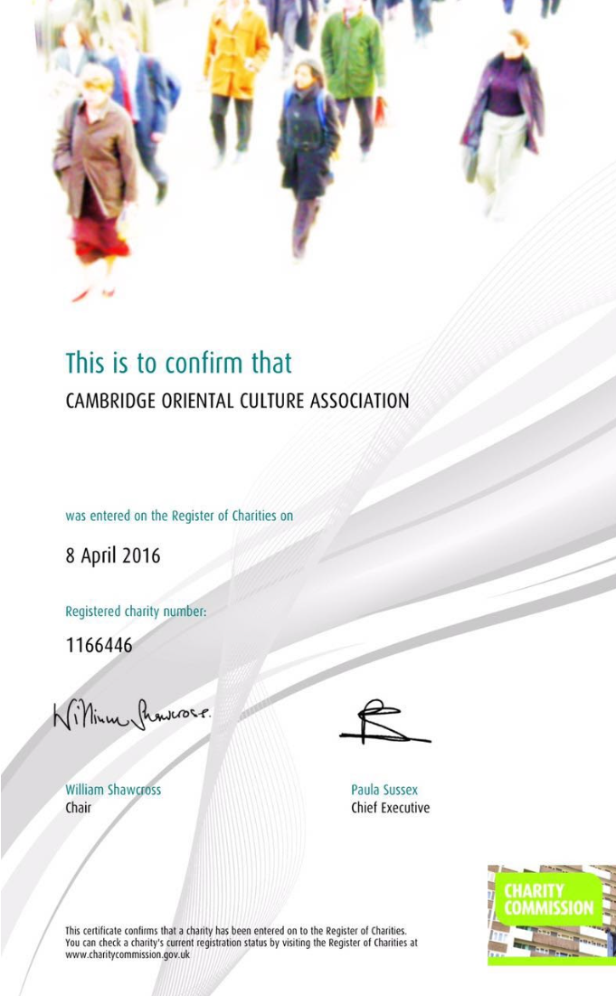 The Cambridge Oriental Culture Association (COCA) was established in the Oct. 2011. In April 2016, it became an official charitable Incorporated organization (CIO) authorized by the United Kingdom government. The charity number in Charity Commission is 1166446. We hope to face the public and bring the academic research to the need of the society, in such a way so as to create a bridge of communication which can connect the academic and the public, the East and the West.